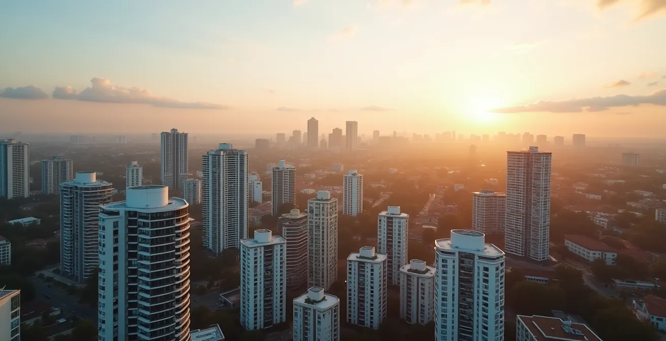 This is what a transitioning urban neighbourhood looks like from above, where older structures give way to modern development, signalling a shift in the area’s economic foundation.